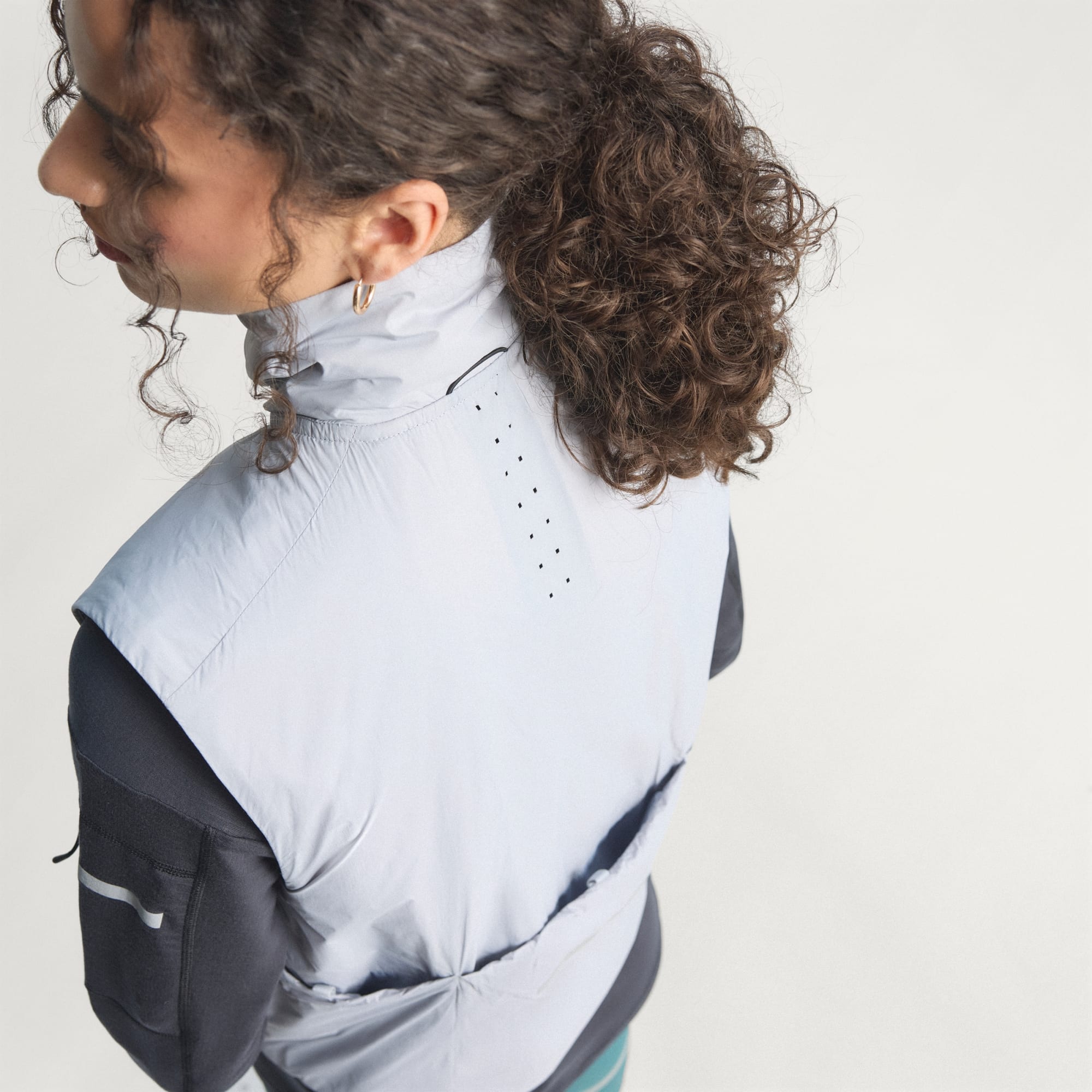 The image depicts a person wearing a black top, a light-colored jacket, and loose-fitting jeans, standing against a plain background with their arms raised above their head.
